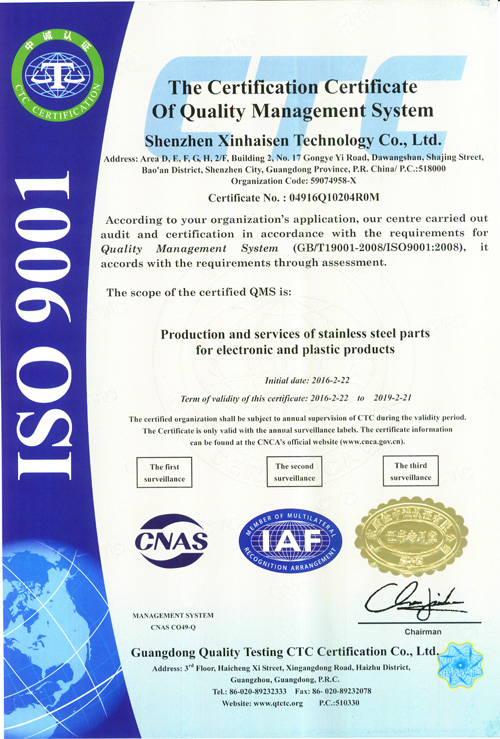 深圳市鑫海森科技有限公司成立于2006年,坐落于中國廣東省深圳市沙井鎮(zhèn),地理位置優(yōu)越,對于我司原物料采購及協(xié)作加工有無法比擬的迅速性和高品質性。 我司主要進行精密五金件的加工,產品涉及的范圍相當廣泛,涵蓋了通訊、聲學、光學、醫(yī)療、安防、機械、航空、陸運工具、家電等等領域。本公司目前產能1000^2全自動生產線6條。加工厚度從0.02mm-1.5mm產品的精度可以做到... 【查看詳情】